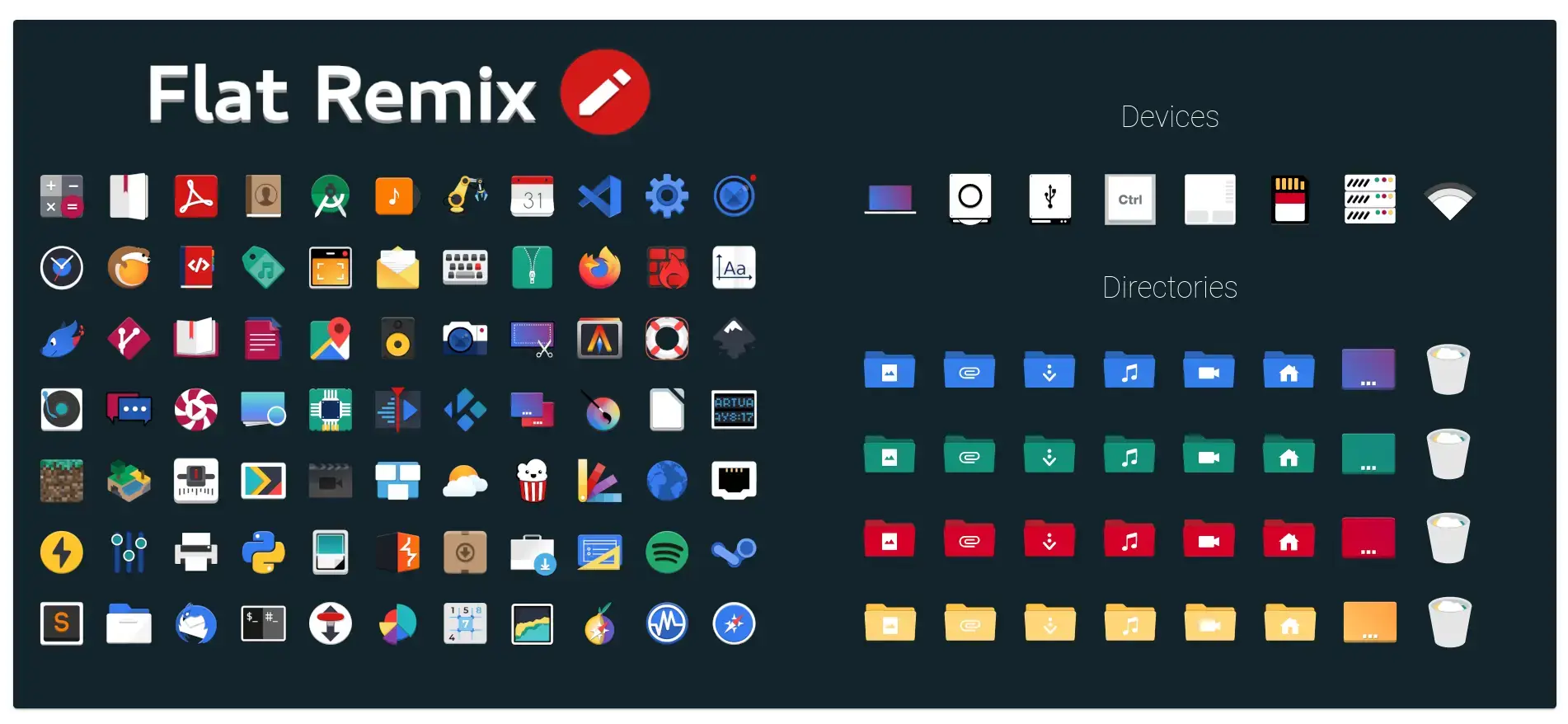 Flat Remix includes Blue, Green, Red, Yellow, Brown, Cyan, Grey, Magenta, Orange, Teal, Violet, and Black. Each color comes in Light, Dark, and Light-darkPanel variants.